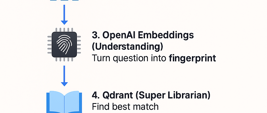 Its job: When it gets the "fingerprint" of your question from OpenAI, Qdrant quickly searches through all my knowledge fingerprints to find the pieces of information that are most relevant to your question. It's like finding the exact pages in a library that talk about what you're asking.