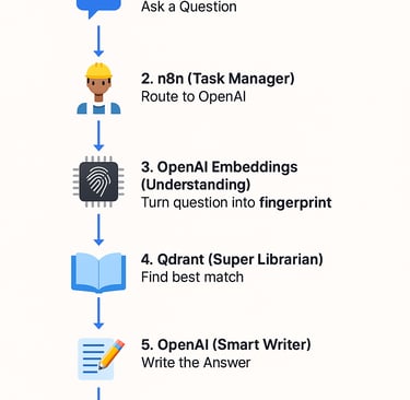Its job: n8n takes your original question and the relevant information found by Qdrant (the "pages from the library"). It then gives all this to OpenAI, along with instructions to "act like me" and "explain how my services can help." OpenAI then crafts a clear, helpful answer based on everything it's been given.